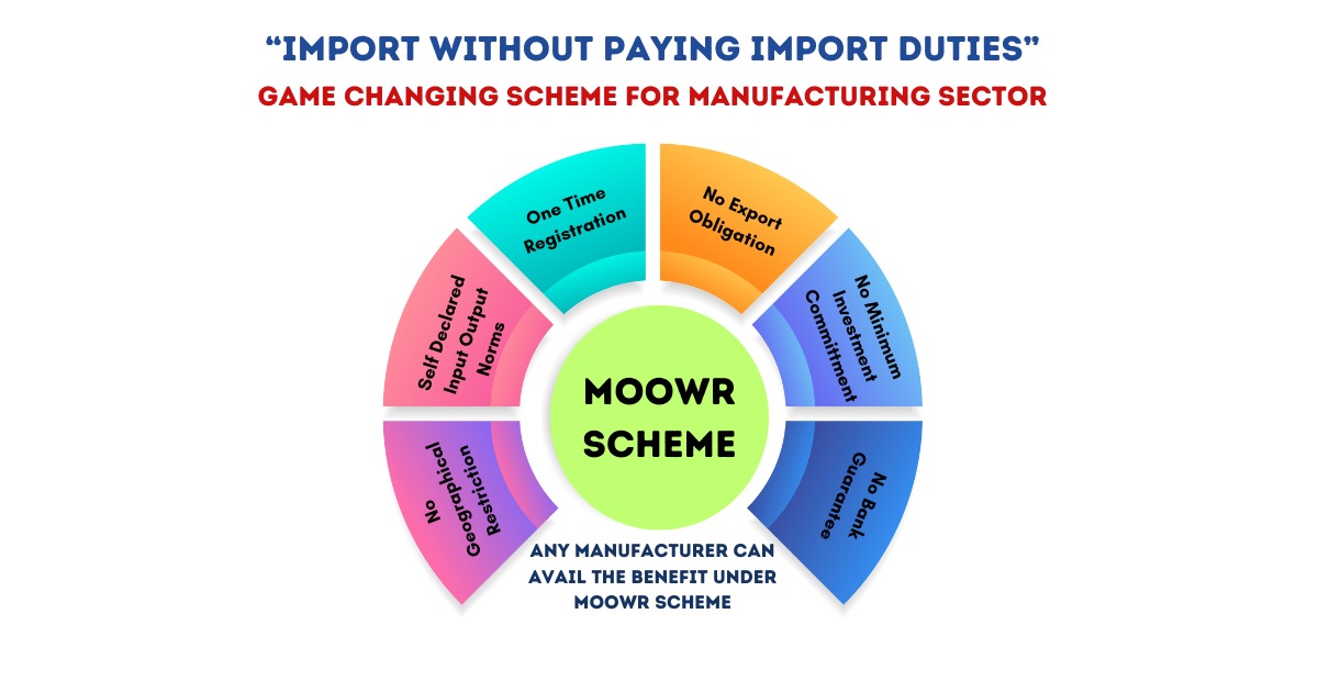 The MOOWR Scheme, also known as Bonded Manufacturing Scheme, enables the import of capital goods or plant and machinery without payment of duty for manufacturing and other operations in India. Under this scheme, the factory of the importer is registered with the Customs to enable the importer to import duty free in India. Only when the life of the machinery is over and it is removed from the factory premises, the import duty is required to be paid. Similar benefits can be availed for import of raw material for processing as well.